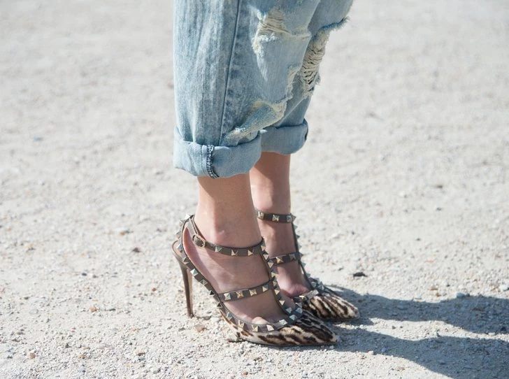 Осторожнее надо быть разве что с рваными «бойфрендами». Если ваш выбор пал на них, верх не должен быть слишком броским и ярким — избегайте футболок со стразами, аппликациями или ярким принтом, вроде леопардового.