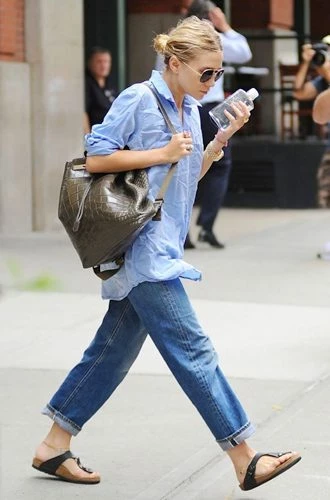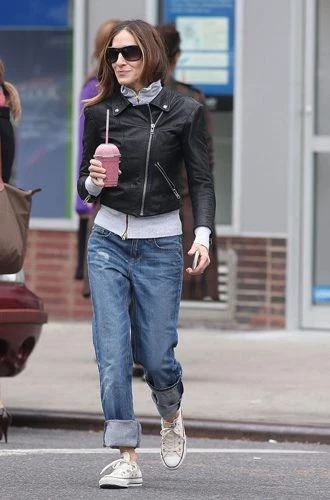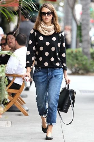 Впрочем, все вышесказанное вовсе не означает, что джинсы-бойфренды нельзя носить без каблуков! Смело дополняйте их балетками, кедами и кроссовками. Пример берите с Миранды Керр, Джессики Альбы, Рианны, Сары Джессики Паркер и Эмили Ратажковски. Правда, здесь есть одно «но»: никакой обуви без каблука с высоким голенищем ─ пусть лодыжки будут открыты. В противном случае, ноги будут визуально казаться короче и полнее, чем есть на самом деле.