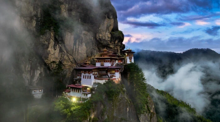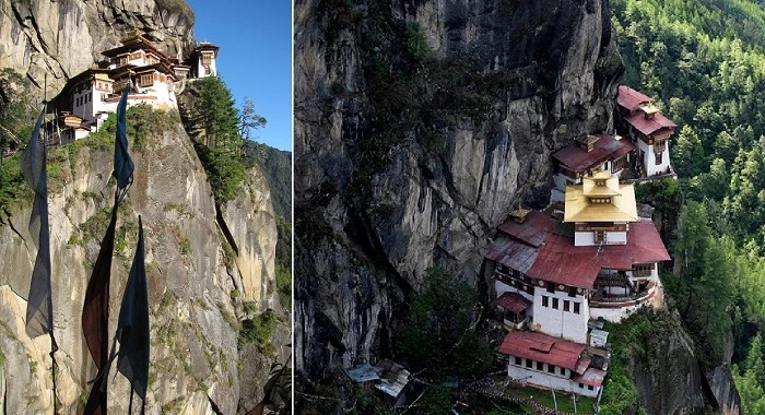 Древний буддийский монастырь Паро Такцанг (или Такцанг-лакханг) является самым знаковым местом Бутана и одним из самых головокружительных скальных комплексов в мире, свисающим с отвесной стены на высоте более 3,1 тыс. м над уровнем и около 700 метров над глубоким ущельем долины Паро. По легенде, храм начали строить еще в VIII веке, после того, как Гуру Ринпоче (основоположник буддизма в Бутане и его король), сидя верхом на дикой тигрице прибыл в Тибет и поднялся в одну из пещер, где медитировал 3 года, 3 месяца, 3 недели, 3 дня и 3 часа. В память об этом событии его последователи построили здесь монастырь, который был значительно поврежден в конце 1690-х гг.