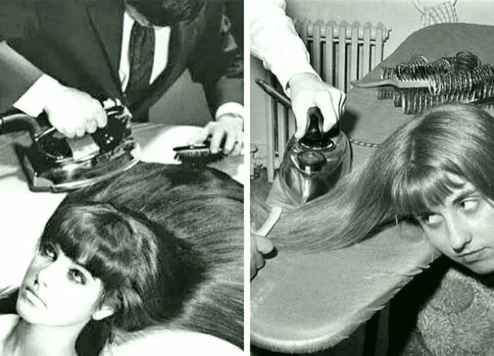 Прямые волосы также были в тренде, и чтобы их выпрямить, использовался утюг! Не просто для глажки одежды. Женщины аккуратно подкладывали чистую ткань между утюгом и волосами, а затем аккуратно проскальзывали утюгом по прядям волос, чтобы придать им желаемую форму.