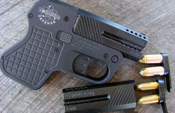 Фактически Double Tap является современной версией дерринджера и работает по такому же принципу. Для перезарядки оба ствола, объединённые в одном блоке, откидываются вперёд, а гильзы выбрасываются автоматически. В рукояти спрятан картридж с двумя патронами, поэтому пистолет можно быстро перезарядить и сделать ещё один выстрел. Самое интересное в нём – это возможность снаряжения двумя видами патронов: 45-го калибра и 9-миллиметровыми. Для смены калибра нужно всего лишь заменить ствол, наличие инструментов для этого не требуется.