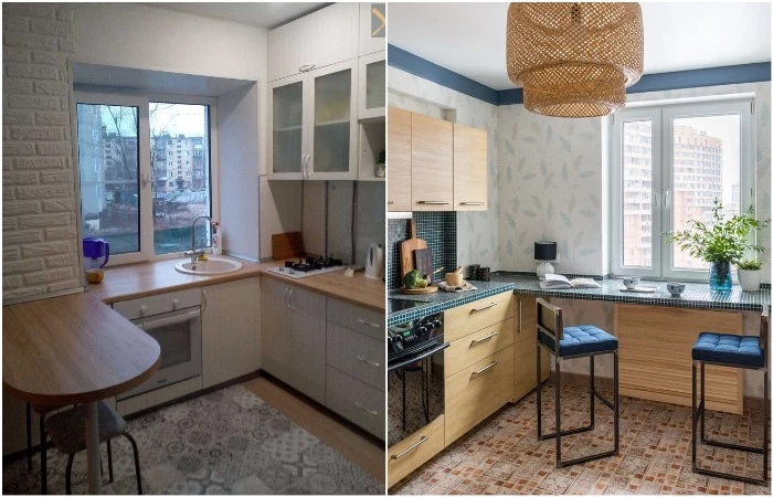 Решится на этот шаг сложно только вначале, а потом осознаешь, насколько грамотным и продуманным было данное решение. Во-первых, при такой планировке на кухне появляется дополнительное рабочее пространство, которое можно использовать в качестве обеденной зоны, для готовки, хранения посуды и мелкой бытовой техники, и пр. Некоторые монтируют в новую столешницу раковину, чтобы посуду можно было мыть без искусственного освещения, любуясь открывающимися из окна пейзажами.