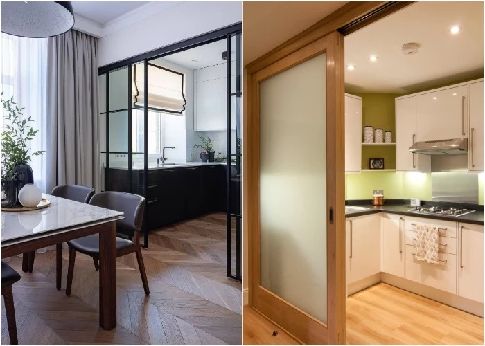 Еще один вариант – разделить коридор и кухню стеклянной перегородкой. Он подойдет для тех людей, которые не хотят, чтобы во время готовки запахи распространялись по всей квартире или с прихожей несли грязь на кухню. Перегородка выглядит легко, воздушно, не препятствует попаданию солнечного света в обе комнаты, но при этом создает ощущение отдельного пространства.