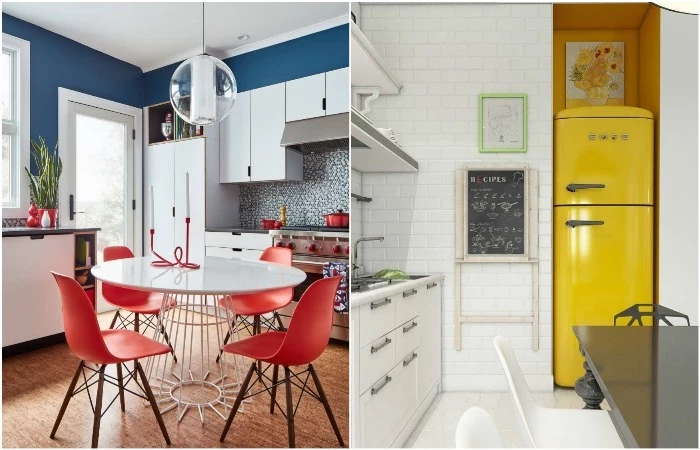 Кроме мебели необычных оттенков, для акцента подойдет яркая бытовая техника. Вместо прозрачного электрического чайника можно поставить красный, вместо классического белого холодильника – желтый. Чтобы такие предметы не выглядели в интерьере инородно, поддержите цветовую гамму с помощью мелких деталей: посуды на открытых полках, штор, подушек на стульях, полотенец и пр.