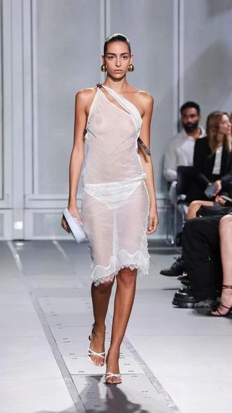 Но настоящую жизнь все же показали нам Saint Laurent и Coperni: брючный костюм может повторять складки, да и нет в этом ничего страшного и криминального — вы же носите эти брюки. А модная прозрачная комбинация так и намекает, что надета она была спросонья, когда женщине, мягко говор, нет дела до безупречной безупречности — массивные серьги и гладкий пучок решают.