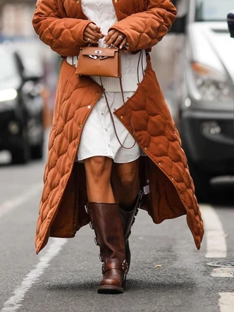 Когда-то давно чопперы носили только байкеры, а теперь они являются чуть ли не главным атрибутом трендового образа. Именно сапоги в байкерском стиле включают в себя сразу и стиль, и комфорт. Благодаря своему брутальному виду они прекрасно разбавят повседневные образы и заставят обладательницу по-новому взглянуть на привычный аутфит. С чем их стилизовать? Обувь будет эффектно смотреться с короткими шерстяными юбками и плотными колготками, поверх которых можно надеть вязаные гольфы или высокие носки в рубчик.