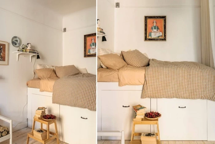 Кровать на подиуме с вместительными системами хранения – лучший выход для владельцев малогабаритных квартир с одной жилой зоной.