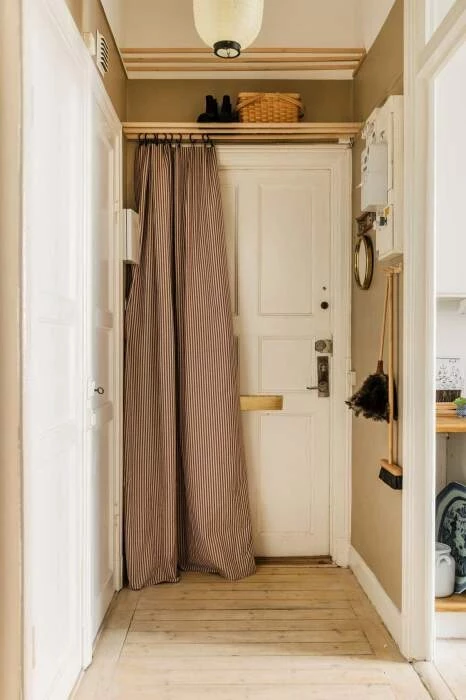 Многие так и не поняли задумку со шторой в полоску, прикрывающую входную дверь квартиры, как и с веником и метлой на стене прихожей. | Фото: trustload.com.