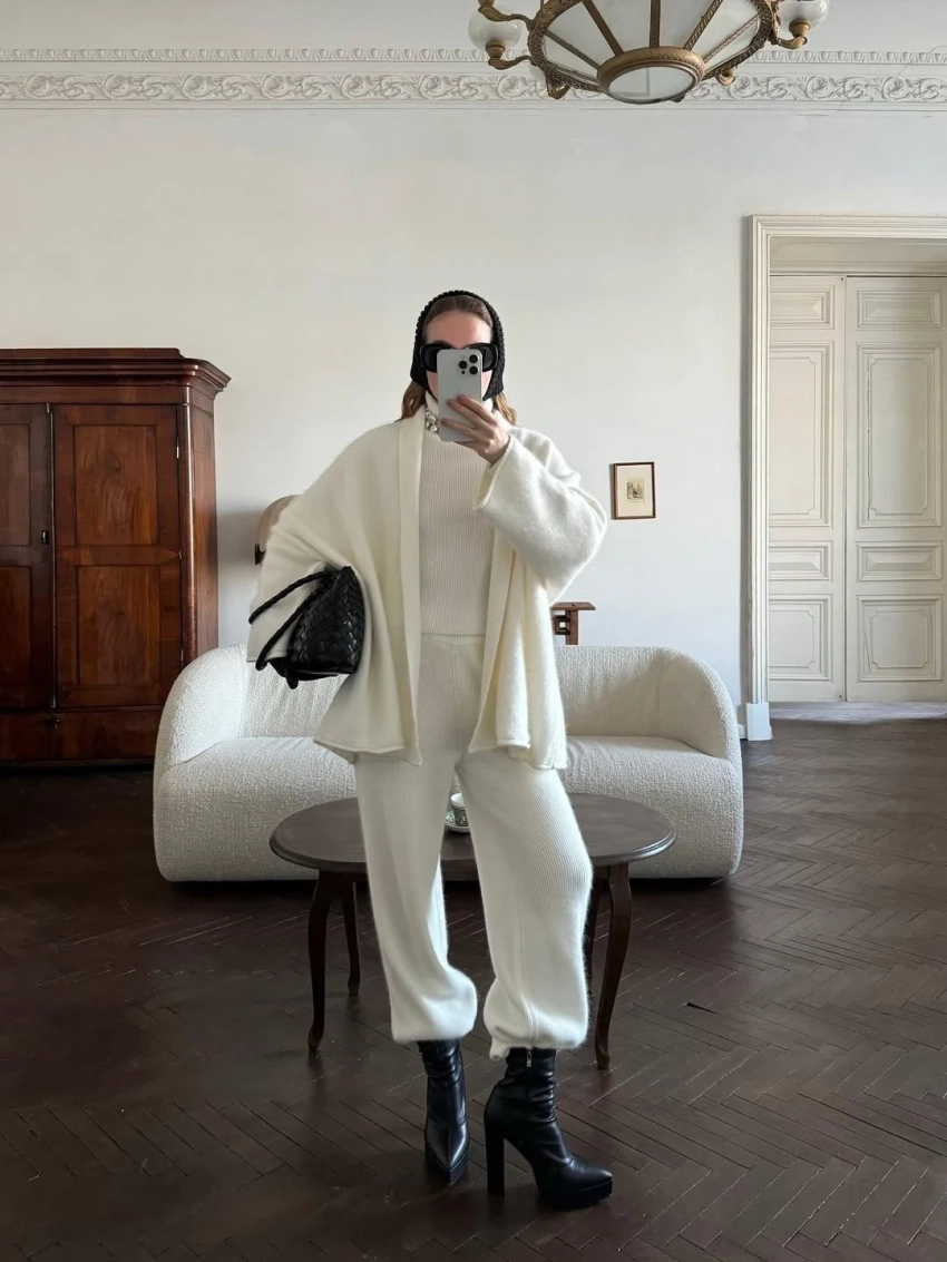 Секрет комплекта — в мягкой фактуре и собранности силуэта. Достаточно накинуть сверху объемное пальто, дубленку или укороченный пуховик — и образ будет выглядеть дорого и современно.