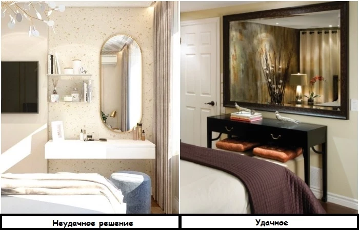 • чтобы не нарушать гармонию в спальне, не вешайте в комнате овальные зеркала – они плохо сочетаются с продолговатым изголовьем кровати.