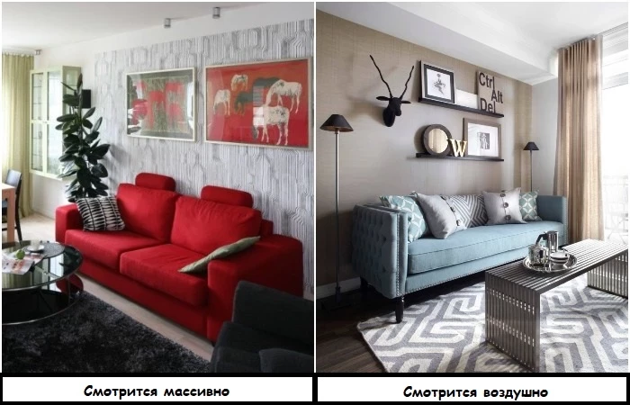 Диван на ножках выглядит легче и воздушнее