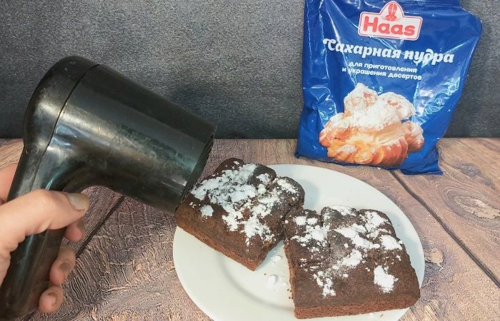 Для начала следует обильно посыпать выпечку сахарной пудрой. После чего поднесите к ней фен и включите его. За счёт потока горячего воздуха пудра быстро начнёт плавиться, превращаясь в красивую глазурь на выпечке. Этот простой способ также позволяет избежать лишнего беспорядка на кухне.