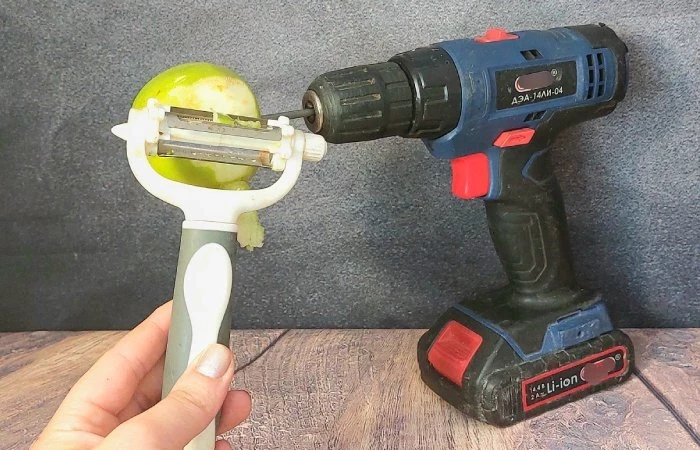 Представьте ситуацию, в которой вам нужно очистить целую корзину яблок. Хозяюшки сразу подумали про овощечистку. Но оказывается, ее можно отлично модернизировать. И поможет нам в этом дрель. На светило следует разместить яблоко. После чего поднести к нему овощечистку и включить дрель. Советуем делать это вдвоём, так как держать овощечистку и включенную дрель может быть неудобно. Однако с помощью нашего совета вы сможете почистить целую гору яблок за считанные мгновения.