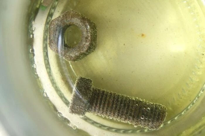 Отмачивание. Если метиз никак не поддается или ржавчина на гайке/болте носит капитальный характер, то настоятельно рекомендуется сначала попытаться «размочить» коррозию резьбового соединения в какой-нибудь достаточно агрессивном химическом веществе. На эту роль подойдет большинство известных кислот: серная, соляная, уксусная, лимонная, ортофосфорную и другие. Если нет возможности погрузить деталь в жидкость полностью, то вокруг метиза придется соорудить пластиковый или металлический бортик, который позволит залить кислоту сверху.
