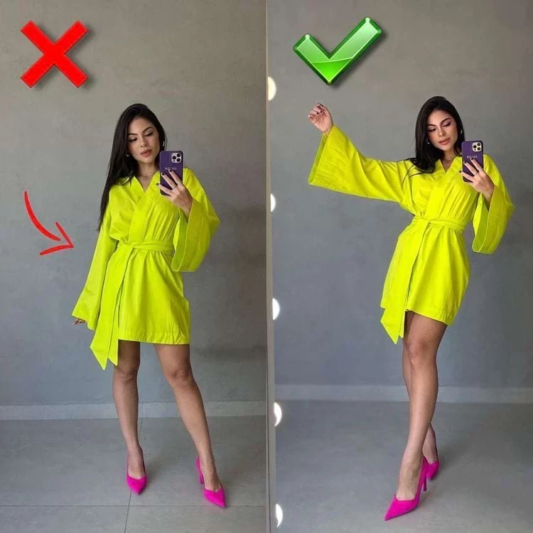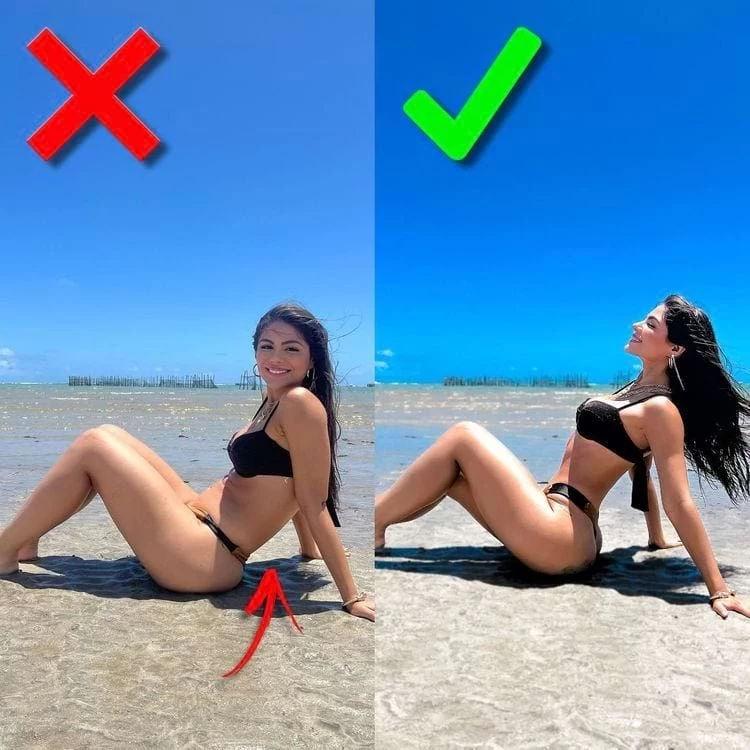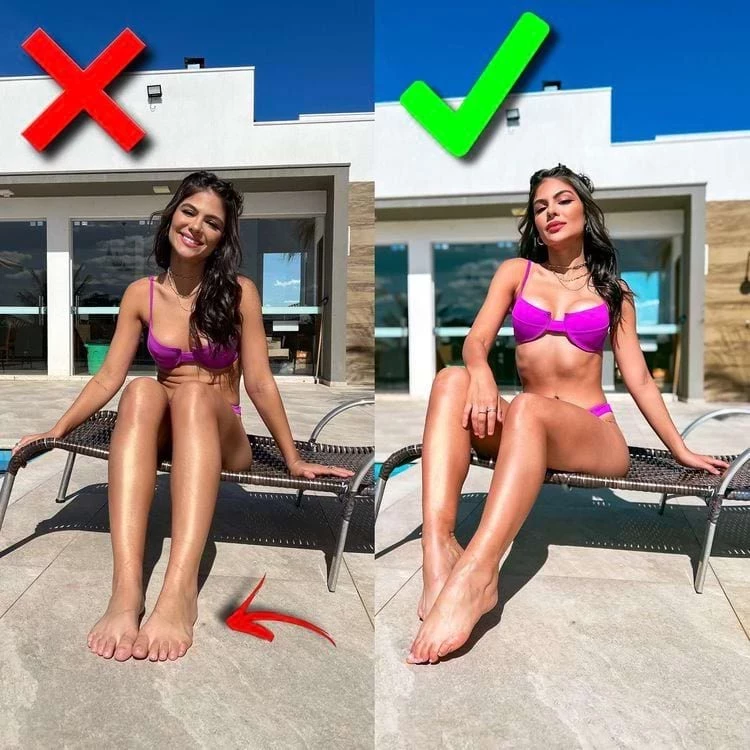 Будьте осторожны с переносом веса тела на руки, это сделает вас толще на фото. Лучше отодвиньте руки от туловища и прогнитесь в пояснице