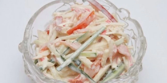 На порцию на двоих берём 6 крабовых палочек, пару яблок, огурец, помидор, зубчик чеснока, ложку майонеза высокой жирности (почему высокой? Да потому что вредный майонез становится менее вредным, когда жирность высока – не будет скачка сахара в крови). Всё нарезаем, салат на двоих – готов. Не забудьте запить чистой водой. Сыты будете долго.