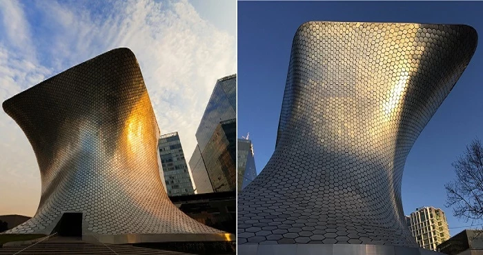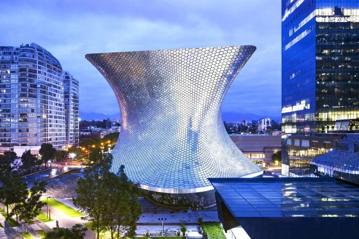 Мерцающий фасад частного Музея Сумайя (Museo Soumaya), несомненно, привлекает внимание, а неправильная форма гигантской «чаши» заставляет задуматься, как такое возможно. Но как показала жизнь, параметрическому проектированию подвластно все и даже больше. Поэтому создание подобной конструкции, поддерживаемой 28 изогнутыми стальными колоннами и облицованной мерцающими шестиугольными стальными элементами (всего их 16 тысяч!), не является никаким чудом, разработчиков нужно было лишь точно задать параметры и следовать алгоритмам. Именно это и сделал автор проекта – мексиканский архитектор Фернандо Ромеро и группа инженеров-строителей. Благодаря современным возможностям и высокотехнологичным материалам параметрическое здание стало одной из главных архитектурных достопримечательностей Мехико, демонстрирующей возможности такого рода проектирования. Стоит отметить, что кроме нетривиальной формы, фасад здания обязательно порадует динамичностью, ведь он покрыт отражающими элементами, меняющими его облик в зависимости от времени суток, дополнительного освещения, окружения и угла обзора.