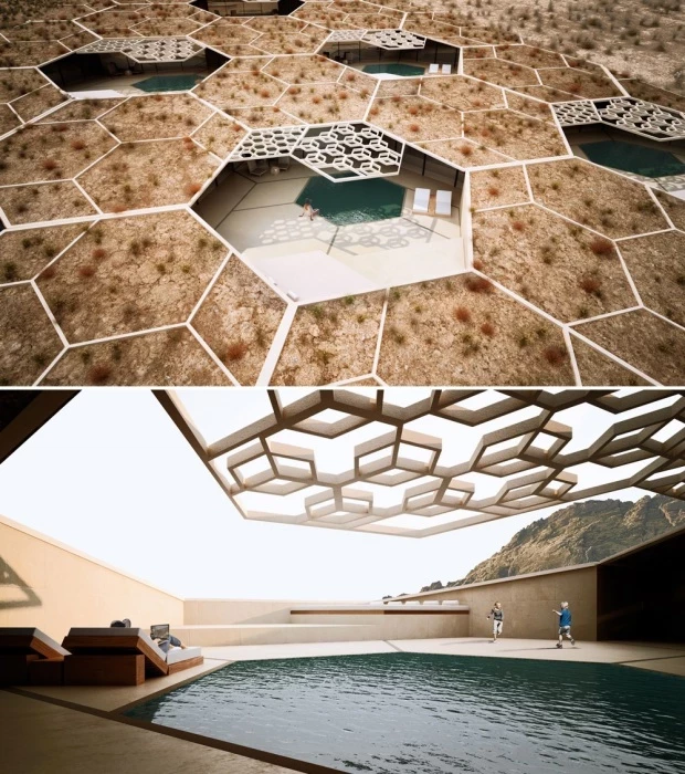 Роскошный курорт Peak от Studio Symbiosis – это причудливый архитектурный объект, интегрированный в природный склон пустынного ландшафта индийского штата Раджастхан. Идея параметрического дизайна исходила из особенностей рельефа и природного окружения, а также местной традиционной архитектуры. Рекреационные пространства, заглубленные в землю, образуют волнистую поверхность, согласующуюся с окружающим пейзажем, что не только выглядит органично и привлекательно, подобное расположение структур как нельзя лучше содействуют энергоэффективности и отвечают строгим принципам устойчивости, учитывающих и воздействие на природный оазис. А вот шестиугольные сегменты, из которых и состоит основная часть архитектурного комплекса (как объединяющие элементы) отсылает к национальным истокам и традициям регионального строительства.