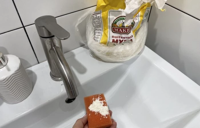 Просто возьмите с кухни немного муки. Насыпьте ее на губку и тщательно натрите ей стальную поверхность. Вы удивитесь результату. Сталь будет сиять. И без каких-либо дополнительных затрат.