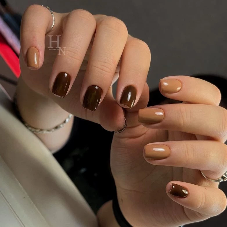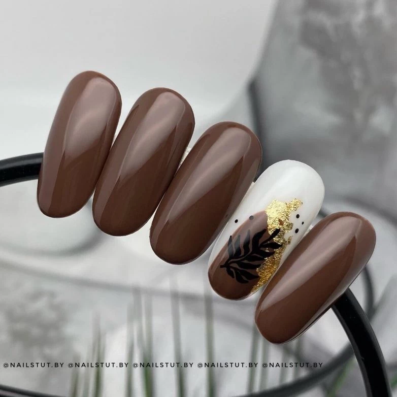 Аппетитные оттенки шоколада, карамели, крема и сливок выглядят на ноготках просто завораживающе. Оттенки кондитерских изделий переплетаются между собой, создавая ассоциации вкусных шоколадных пирожных со взбитыми сливками.