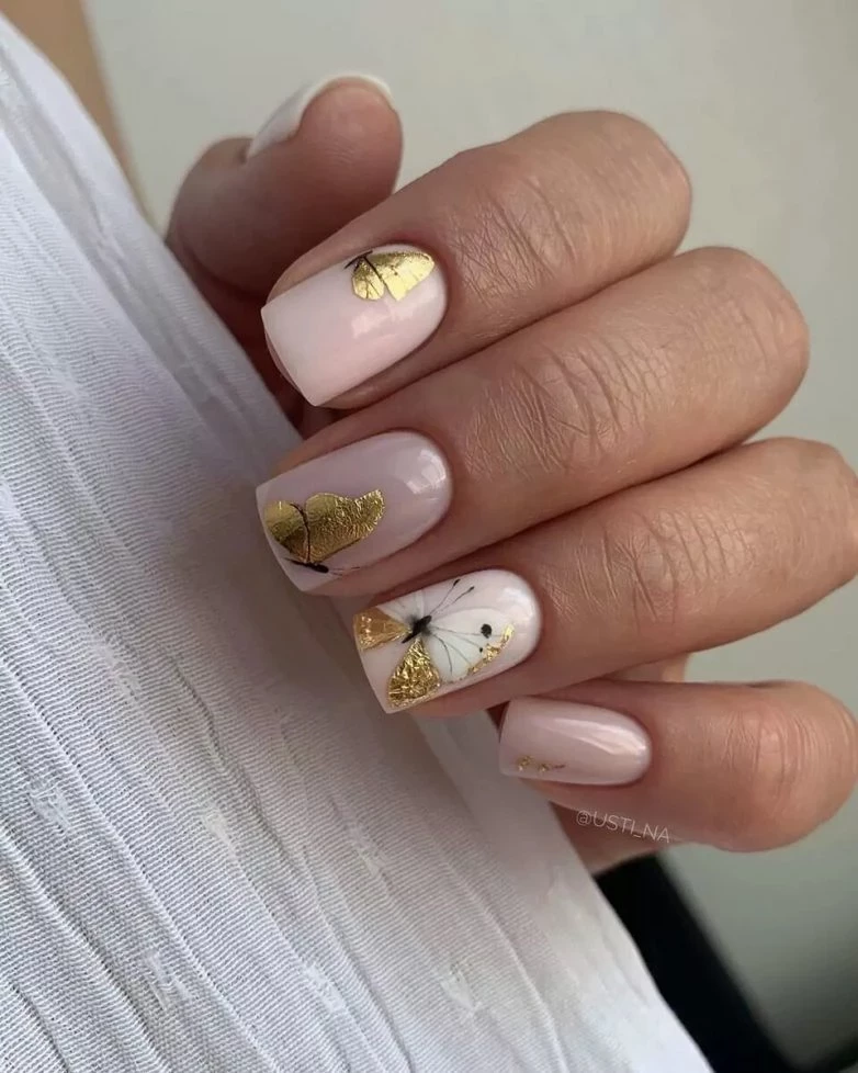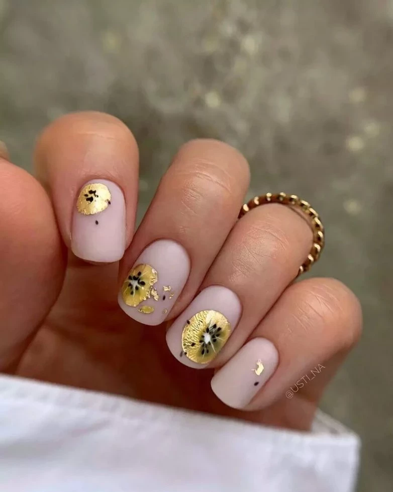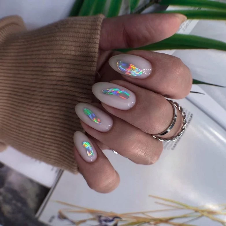 Этот дизайн нашел продолжение в осеннем маникюре. Идеально подходит к осени маникюр с блестящими кляксами на светлой ногтевой пластине.