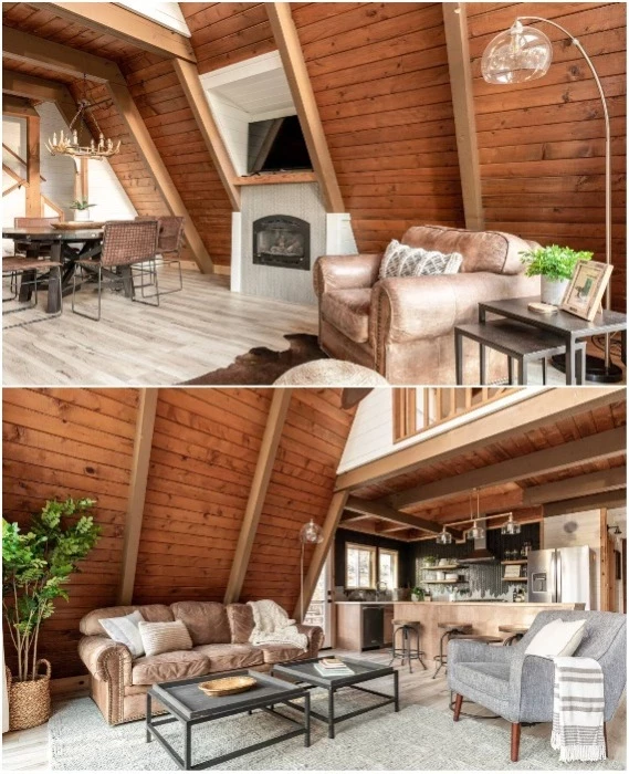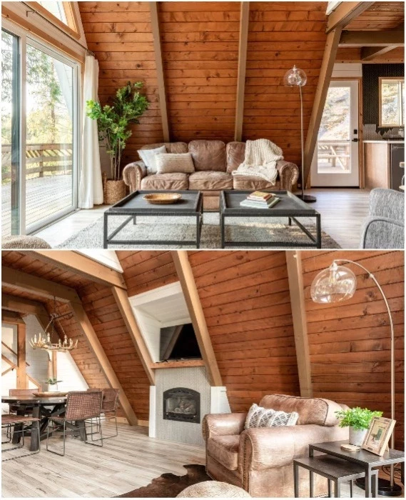 Прямоугольная вставка в А-образную структуру Acorn Falls позволила обустроить традиционные комнаты. | Фото: lifetinyhouse.com.