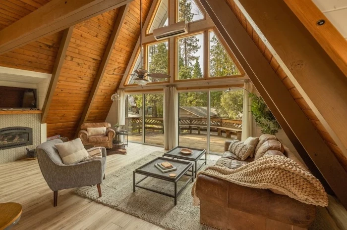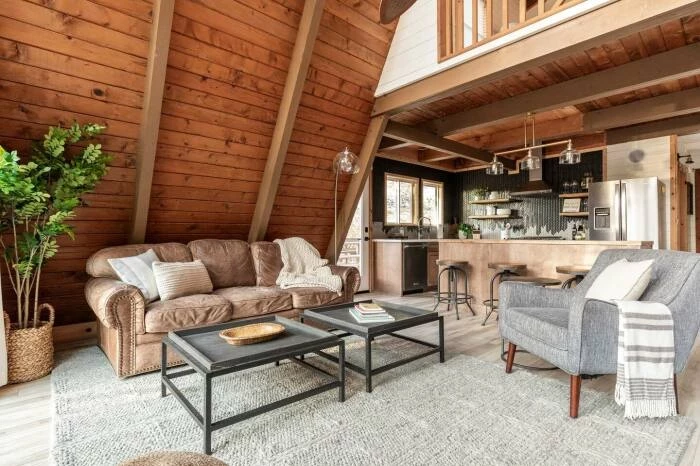 Зона гостиной в лесном доме Acorn Falls находится сразу у входа.