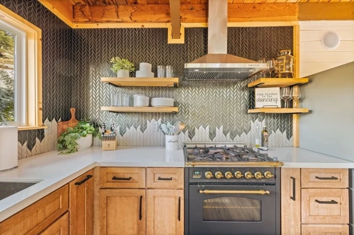 Кухонный фартук стал украшением интерьера (Acorn Falls, США). | Фото: moderntinycabin.com.