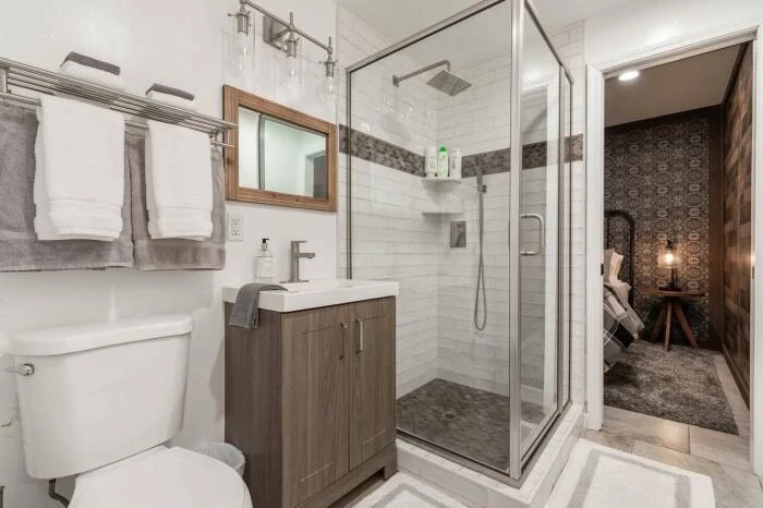 В лесном домике при главной спальне предусмотрена индивидуальная ванная комната (Acorn Falls, США). | Фото: moderntinycabin.com.