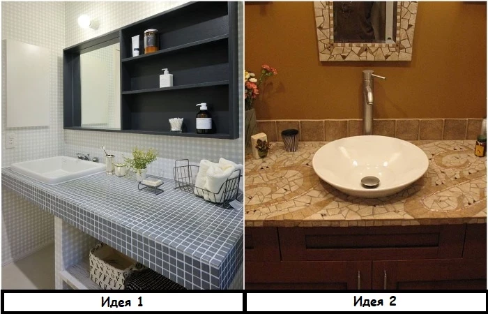 Для боковин используется один вариант кафеля (чаще всего, такой же, как и в других зонах комнаты), а для столешницы – другой. Поверхность тумбы может состоять из крупной плитки с геометрическим, абстрактным или цветочным узором. Хорошо, если она будет повторять цвета, ранее задействованные в интерьере – тогда композиция получится цельной и гармоничной.