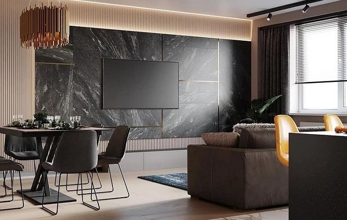 Темная матовая плитка отлично смотрится в ТВ-зоне. / Фото: colodu.club