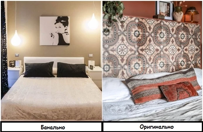 Вместо картины в изголовье кровати, отделайте зону плиткой