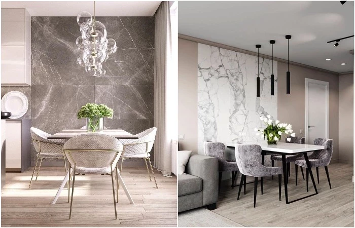 Плитку можно использовать и за пределами кухонного гарнитура, например, оформить с ее помощью стену за обеденной группой. Красиво будет смотреться как мелкая плитка, так и крупная, просто последняя будет проще в уходе и сможет зрительно расширить стену. Что касается цветовой гаммы, здесь вам карты в руки. Плитка может стать гармоничным продолжением стен, а может – контрастом, который разбавит светлую палитру и станет интересным акцентом.