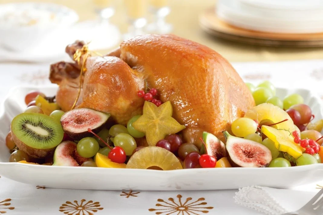 • Птица. Курица, индейка, утка с фруктами, медом или специями (утка с яблоками, индейка с апельсинами).