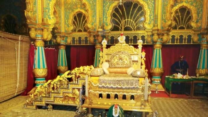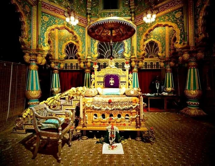 В музее все так же можно увидеть роскошное убранство, массивные серебряные двери, меч Типу Султана, несколько картинных галерей, царские наряды, атрибуты власти, оружие, драгоценности и все то, что сопутствует оформлению дворцовых пространств, среди которых имеются и жилые апартаменты. Но главными достопримечательностями, все же, являются золотой трон (Чиннада Симхасана), инкрустированный драгоценными камнями. Исследователи утверждают, что он принадлежал не только династии Водеяр, имеются подтверждения, что на нем восседали властители более древних родов – короли рода Виджаянагара и династии Пандавам. Не менее впечатляет и деревянная скульптура слона хауда, украшенная …84 кг золота.